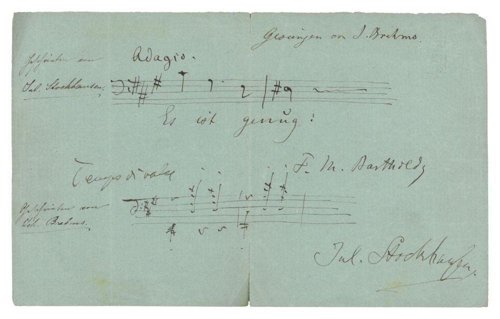 Erstes von Kurt Hofmann erworbenes Albumblatt, auf dem Julius Stockhausen den Beginn der Arie »Es ist genug« aus Felix Mendelssohn Bartholdys Oratorium »Elias« notierte und Brahms drei Takte Walzerbegleitung ergänzte