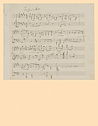 Anmerkung: Reinschrift eines Klavierstücks »Langsam und still.«, datiert: d. 22. Sept. 1894, auf der Rückseite 6 handschriftliche Zeilen von Theodor Kirchner: Ein Gruß aus der Einsamkeit, in trister Stimmung. Am Montag wird mir [...] wieder die Sonne scheinen. Bis dahin. Lebe wohl.; Beiliegend Abschrift es Stücks von der Hand Mathilde Schlüters mit dem von Kirchner hinzugesetzten Titel: Gruß an Frau Mathilde. Schlüter. Theodor Kirchner. Hier auch Eintragungen mit Bleistift und blauem Buntstift