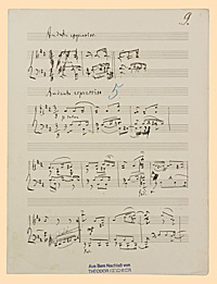 Anmerkung: Arbeitsmanuskripte zu »[24] Präludien« WoO für Klavier zu 2 Händen und »Nur Tropfen« WoO für Klavier zu 2 Händen; Konvolut von Manuskripten mit unterschiedlichen Paginierungen mit schwarzer Tinte und Bleistift. Durchlaufende Paginierung (112 S.) von Kurt Hofmann folgt der von Conrad Hannss übernommenen Reihenfolge in der er das Konvolut von Kirchner erhalten hat. Mehrere Blätter mit mittigen Falzen, einige unbeschriebene Seiten. Ab Seite 49: »24 Prüludien«, Datumsangabe auf Seite 88: d. 30. Sept. 1894 An M. S von Th. K. und auf Seite 90: d. 27 Sept. 1894. An M. S. von Th. K.