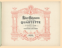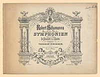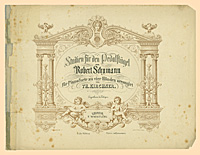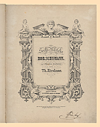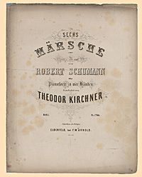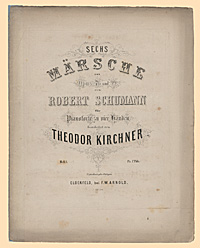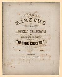 Anmerkung: Unten rechts klein durchgehend paginiert: 59 Seiten, drei Hefte fest eingebunden, Buchdeckel mit marmoriertem Papier bezogen, Titeletikett handschriftlich: Schumann: / 6 Märsche / zu 4 Händen