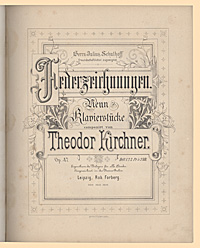 Herrn Julius Schulhoff / freundschaftlichst zugeeignet. / FEDERZEICHNUNGEN. / Neun / Klavierstücke / componirt von / Theodor Kirchner. / Op. 47 [links]