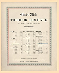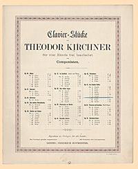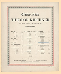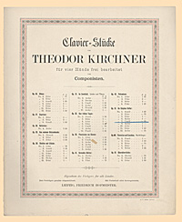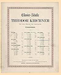 Beschreibung: Handexemplar Kirchners; Vertriebe: Für Holland: A. Roothaan in Amsterdam, Für Russland: G. Sennewald in Warschau, Für Amerika: G. Schirmer in New York, Für Dänemark: Kong Dansk Hofmusikh., Für Schweden u. Norwegen: Eikan & Schildknecht in Stockholm