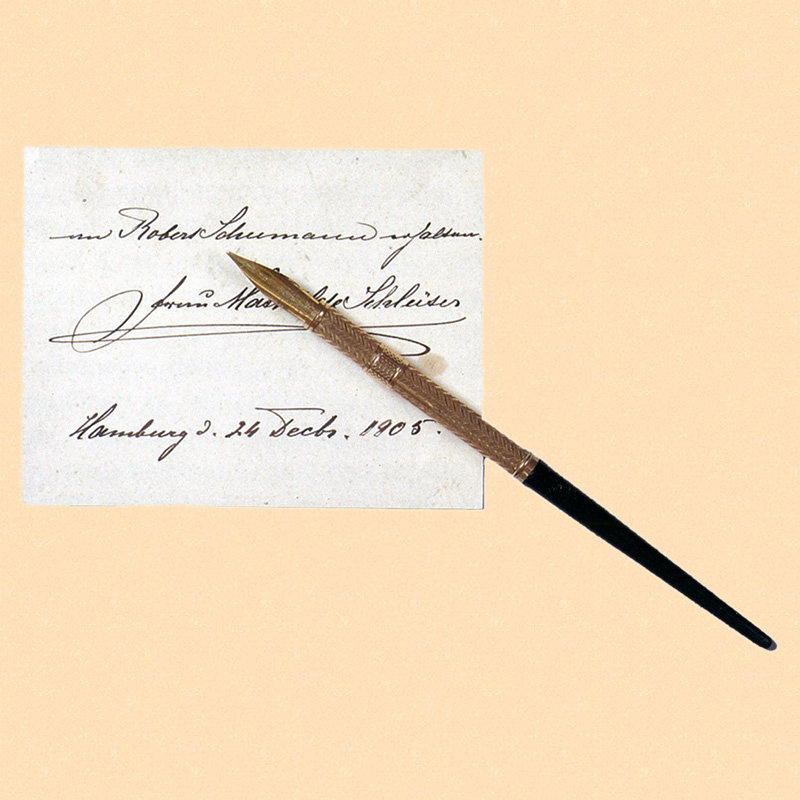 Federhalter von Robert Schumann Ebenholzgriff mit vergoldeter Zugtechnik, verschiebbare Goldfeder mit Prägung „Morton 1st Quality No 5“, Morton, New York, o. J."