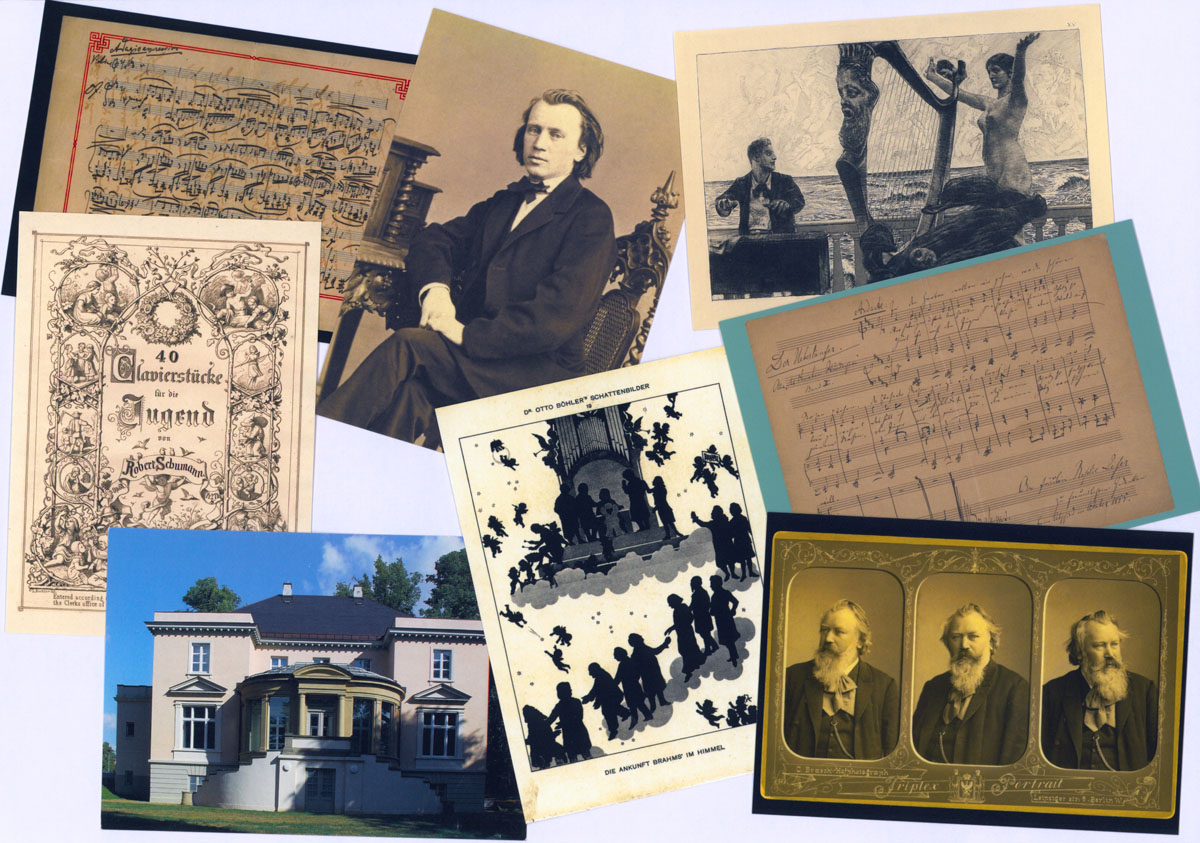Set mit 8 Postkarten-Motiven aus dem Brahms-Institut: Brahms-Portraits von 1862 und 1889, Autografen zu op. 48,2 und op. 78, Schattenbild »Die Ankunft Brahms' im Himmel«, Max Klingers »Brahms-Phantasie«, Villa Brahms und Titelblatt zu Robert Schumann op. 68